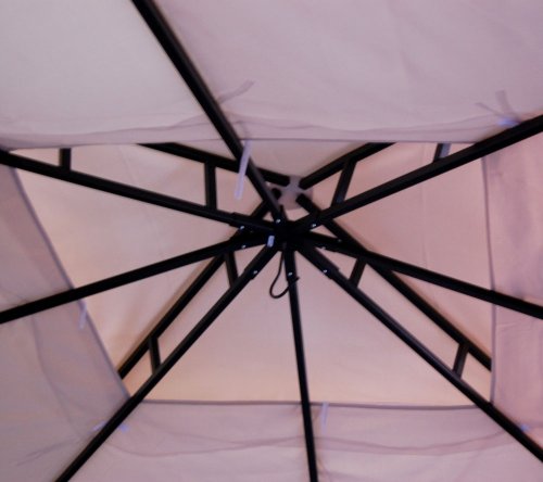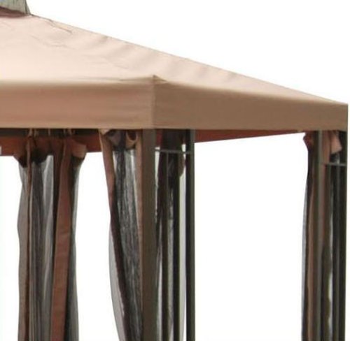 This is an intelligently designed gazebo replacement canopy top cover for most standard 12' x 12' two-tiered gazebos. This 12' x 12' polyvinyl top cover has a two-tier ventilated top construction. The top tier measures 36" x 36". The opening on the bottom tier is 30" x 30". Between the top tier and bottom tier is a functional mosquito netting that allows the replacement canopy to expand upwards and to allow wind gusts. This expansion capability allows this replacement canopy to fit two-tiered 12' x 12' (144" x 144") gazebos. The functional mosquito netting between the two tiers keeps annoying insects from entering through the top of the gazebo. The top tier attaches to the bottom tier with a custom designed velcro seam. Reinforced corners and easy Velcro attach tabs per side make it easy to install on existing gazebos. Brass grommet holes are built in for water drainage. This canopy does not have corner pockets for roof bars to be inserted (i.e., SunJoy). Fastening is provided by velcro straps.
